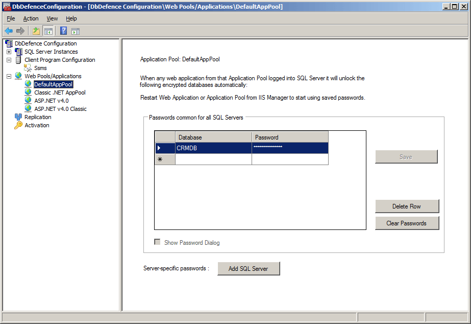 The Client Program Configuration allows configuring client applications to unlock protected databases automatically. This is one of DbDefence's unique features! Without a line of code you can encrypt a database and allow only your application to enter the database. Passwords are stored securely and can't be copied to another server. We recommend digitally signing your application to achieve maximum security.