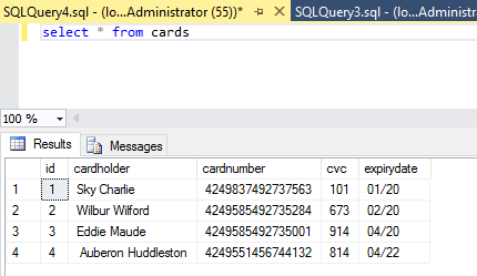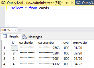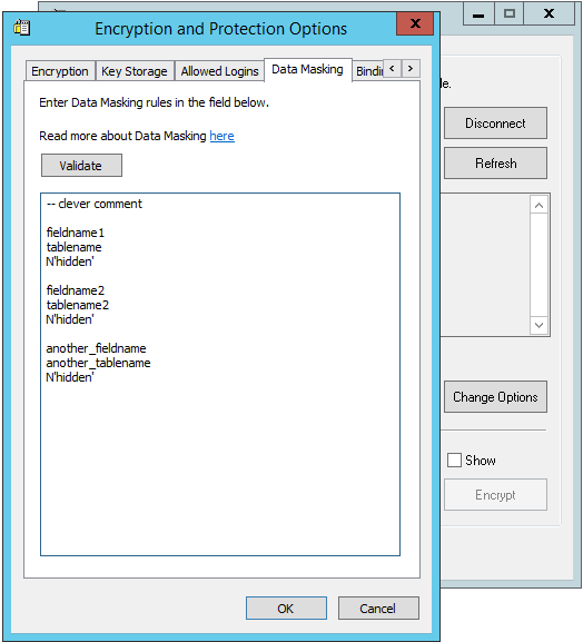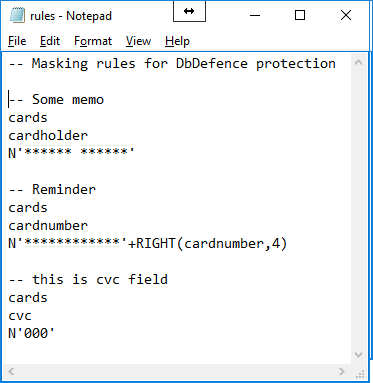Lines starting from '--' are comments and or empty lines are just ignored. The first line of the rule is a table name without quotes or [ ]. In this example, the table name is cards. The second line is the name of the field. In this example it is cardholder. The third line is a mask -the value shown to unauthorized users. This is a value for SQL Server and it may contain functions as shown for cardnumber.