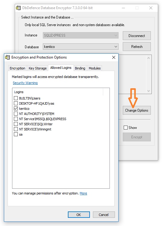 use [mydatabase] open symmetric key dbdx decryption by password='C00lPass!' -- let them access freely: exec dbd_add_login @login='sa' -- let login1 access the database only if he logged with the password mYpAssW0RD exec dbd_add_login @login='login1',@passwd='mYpAssW0RD' exec dbd_add_login @login='BUILTIN\users' exec dbd_add_login @login='SERV\mike'