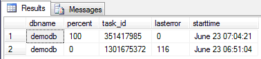Available since version 9. This function lists current and completed encryption tasks started with dbd_encrypt_db. Other encryption processes are not displayed.