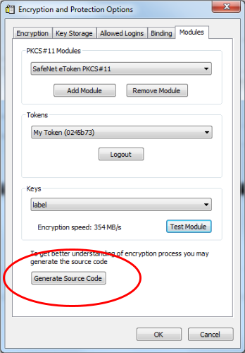To provide encryption transparency DbDefence may generate C/C++ source code for file encryption using selected PKCS#11 settings. You may compile the source code and encrypt/decrypt encrypted database files.