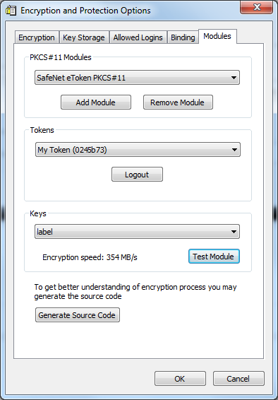 When you switch to PKCS#11 module encryption, AES-128 and AES-256 settings from "Encryption" and "Binding" no longer affect encryption anymore.