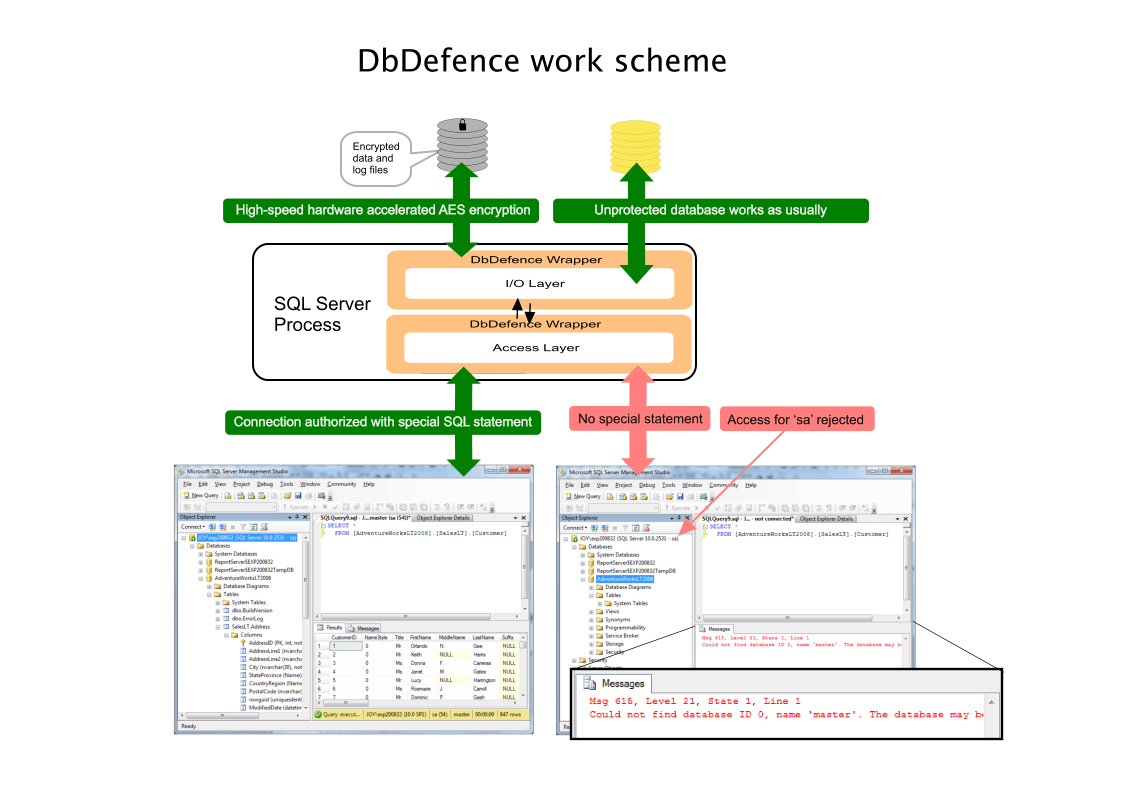 DbDefence works on the file and the SQL object level. This makes it very different from other SQL server encryption software. It can distinguish which object accessed and which denyed/allowed access. Compared to field level encryption software like XP_CRYPT DbDefence has advantages and disadvantages.